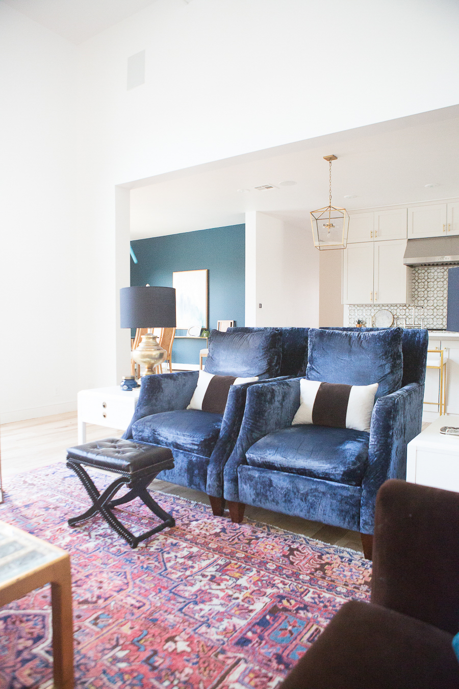 10 Bold Pink and Navy Rugs for Home Decor modern glam design navy velvet chairs velvet sofa gold coffee table leopard pillows-1-4