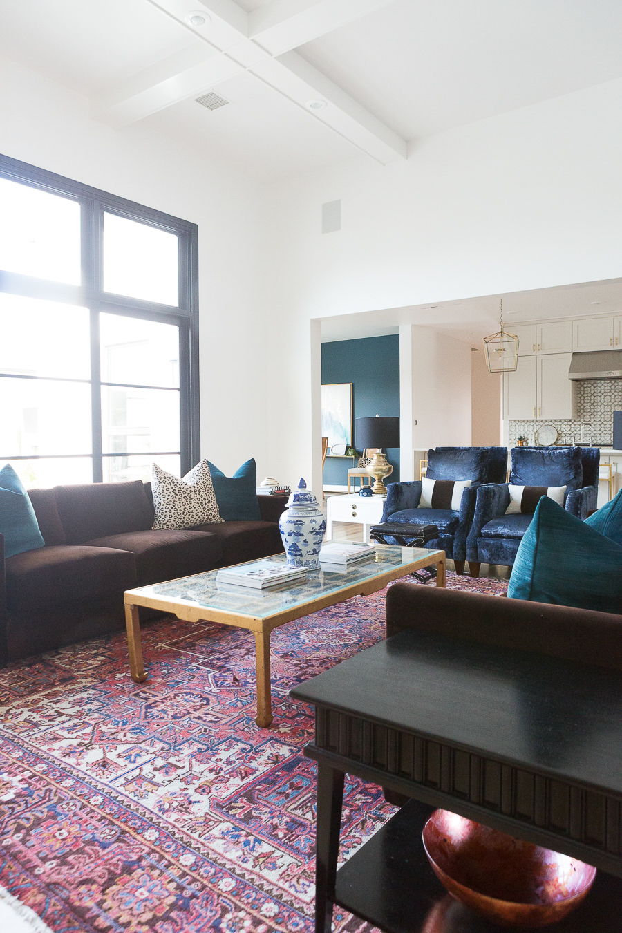 10 Bold Pink and Navy Rugs for Home Decor modern glam design navy velvet chairs velvet sofa gold coffee table leopard pillows-1-5