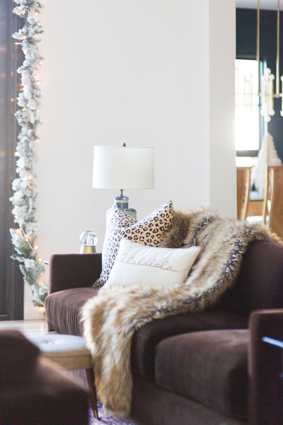 Christmas decor ideas, Holiday decor, Holiday decor ideas, West Elm Holiday Decor, Holiday decor tips and tricks, Tips for Affordable Holiday Decor, glam holiday decor, how to add glam to your holiday decor, glam decor ideas, glam Christmas, canopy bed master bedroom, canopy bed Christmas decor, master bedroom Christmas decor, fur garland, Christmas decor fur, West Elm holiday decor, West Elm Christmas decor, DIY Christmas ideas, DIY Holiday Decor, King of Christmas tree, best flocked Christmas tree