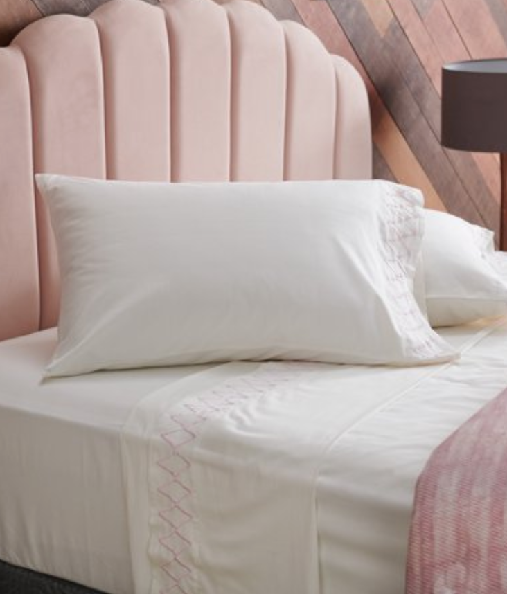 5 Tips to Decorate Your Home with Drew Barrymore Flower Home pink tufted velvet headboard and bed with white embroidered sheets