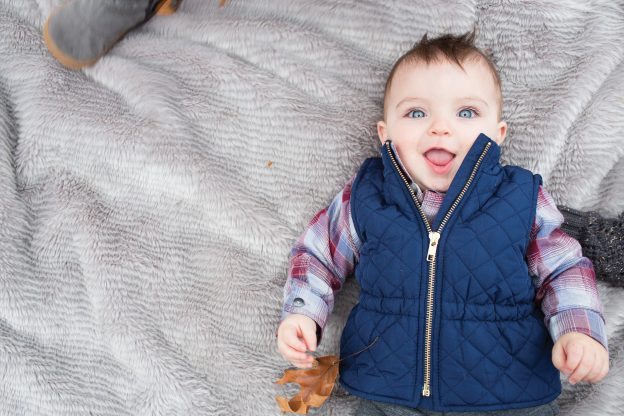 baby in blue vest holding a leaf