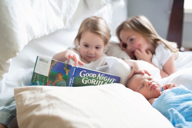 siblings reading to new baby