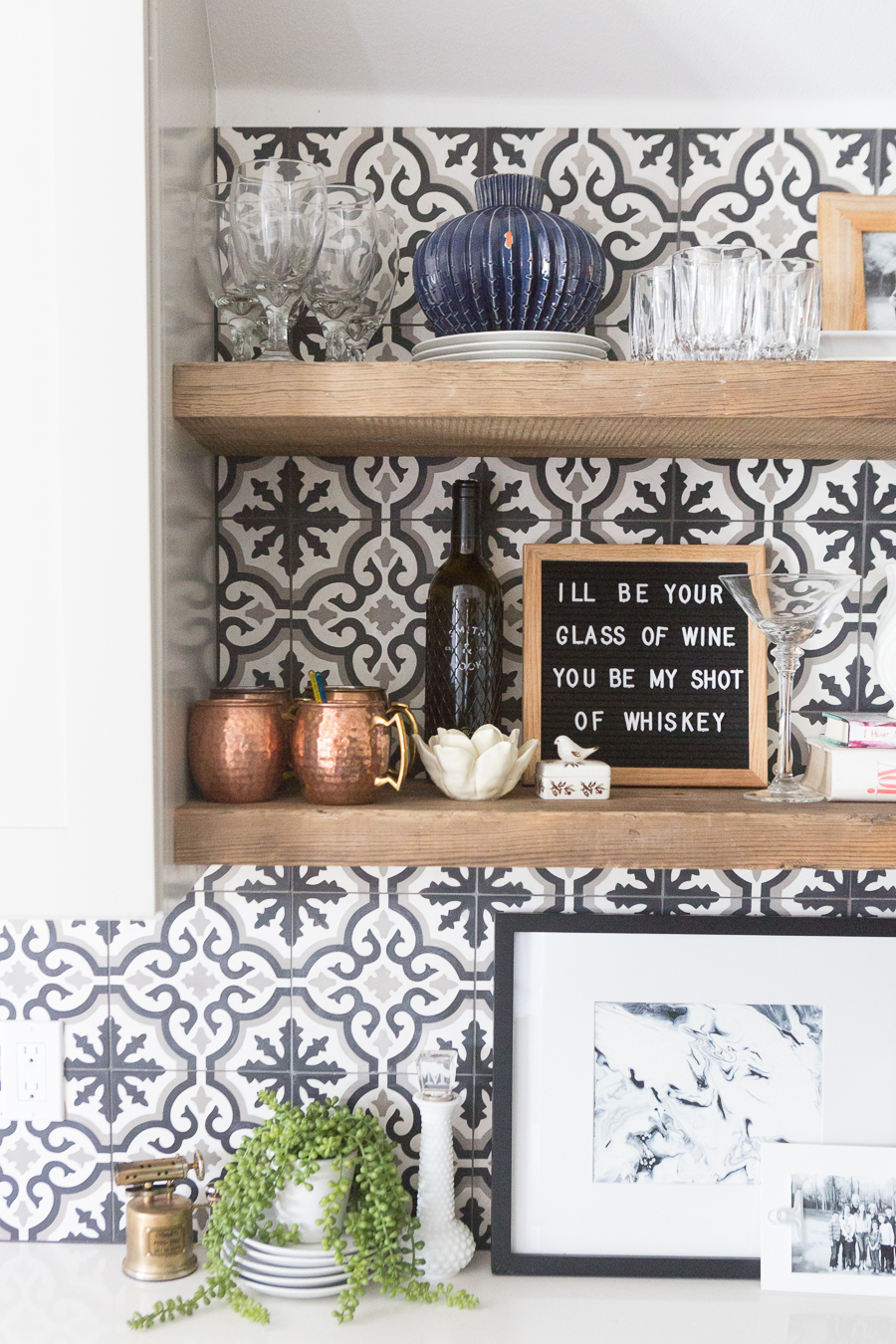 Affordable Ceramic Patterned Tile Backsplash affordable cement tile lookalike black and white patterned tile backsplash open wood shelves kitchen open wood shelves styling ideas how to style open wood shelving blue west elm vase wooden picture frames greige cabinets