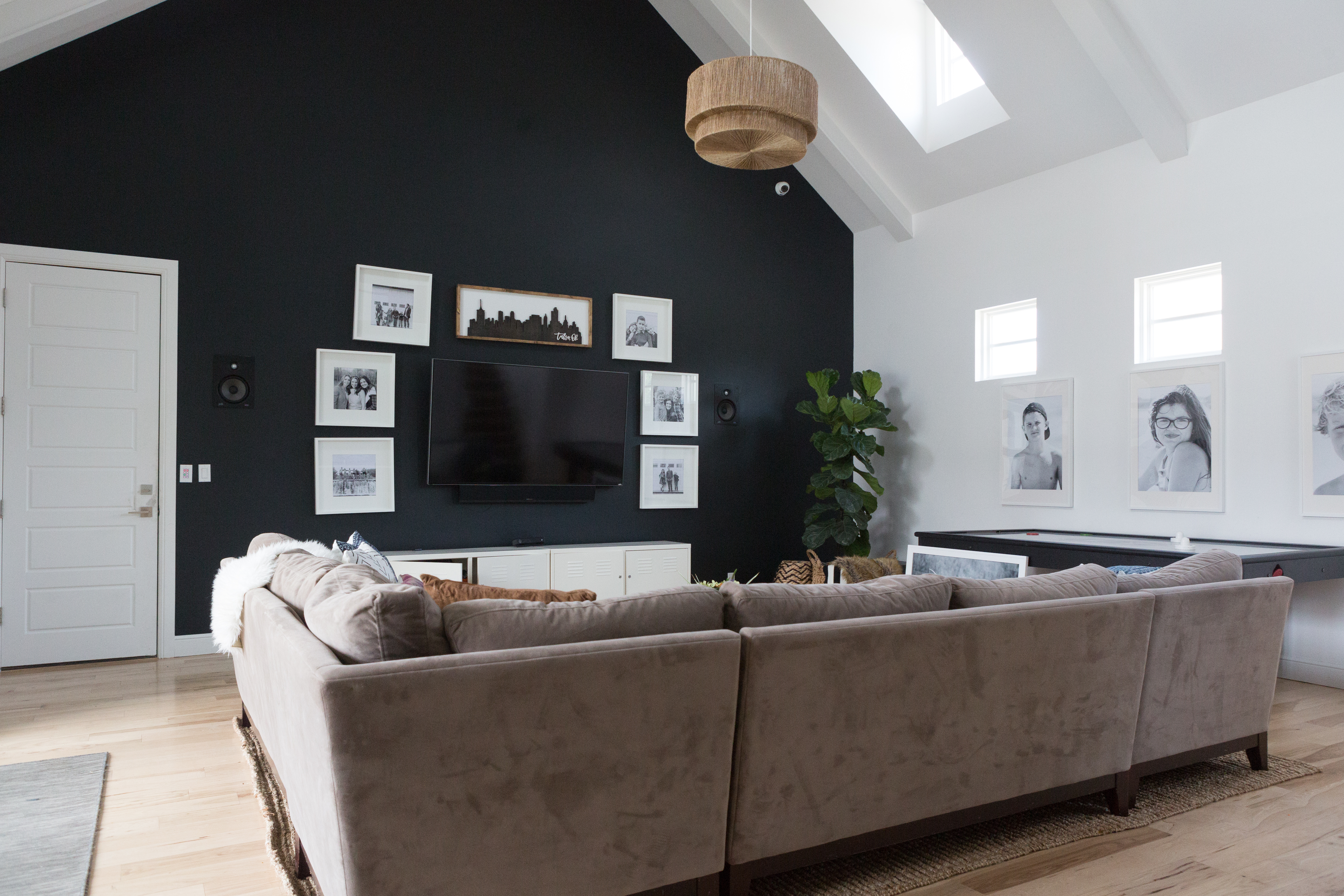 gameroom decor ideas, black walls, gallery wall, lulu and georgia, high ceilings, white walls, black windows, vaulted ceilings, white design, gameroom decor ideas,