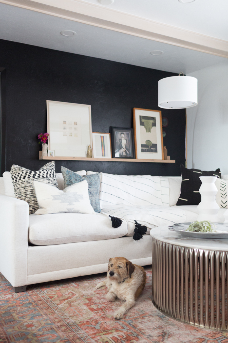 CC and Mike Kane Project Remodel Reveal white L shaped sectional on a terracotta loren rug from CC and Mike THE SHOP round coffee table black accent wall with wood art ledge