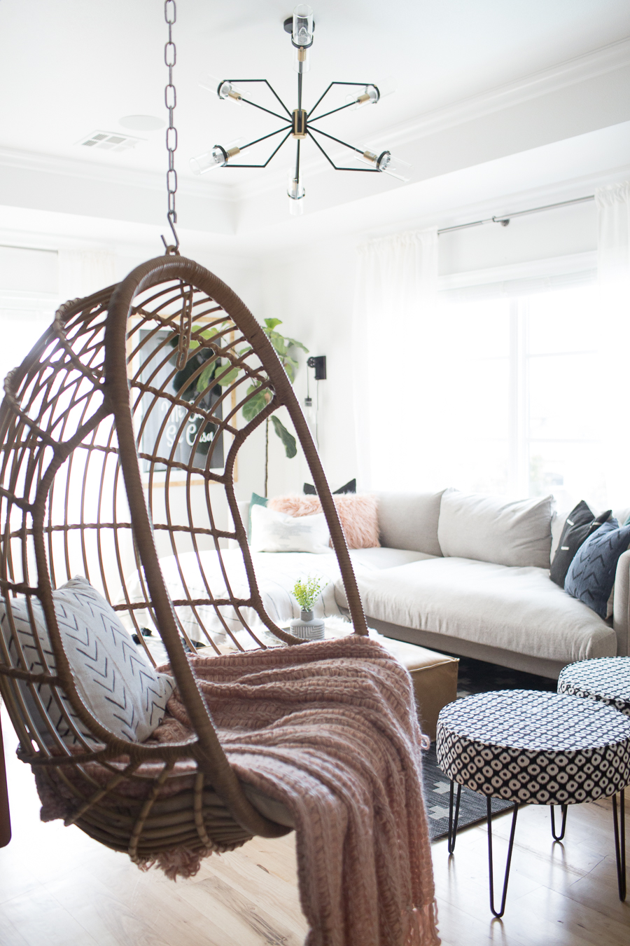 CC and Mike Teen Hangout Room Reveal with Joybird Sectional woven hanging chair in a room white white walls