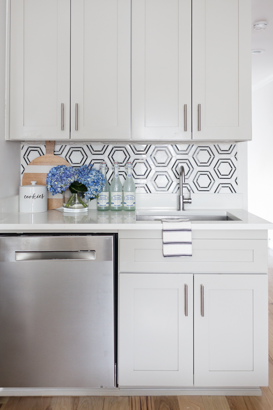 CC and Mike Teen Hangout Room Reveal with Joybird Sectional black and white marble hexagon with gray kitchen cabinets and silver hardware