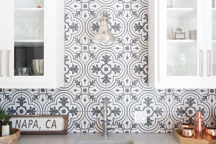 Tusa remodel, bar ideas, patterned tile, Lowes light fixture, backsplash ideas, patterned tile backsplash, cement countertops
