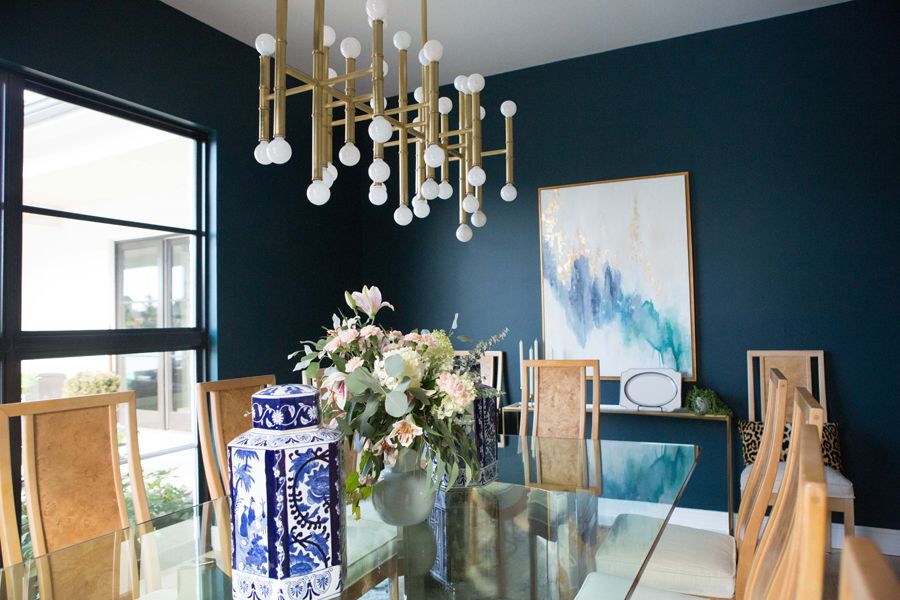 dark walls dining room, best paint colors for dark walls, benjamin moore dark harbor, dark bahrbor paint, green walls, best green paint color, modern glam dining room, dramatic dining room, burl wood, burl wood chairs