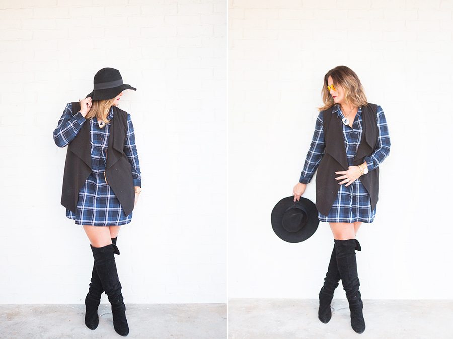 CC & Mike Holiday Outfit Ideas - Plaid Dress and Over the Knee Boots 6