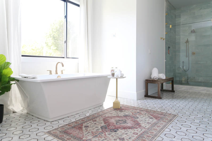 How-to-Update-Your-Rugs-for-Spring pink and gold blush Skye rug on a black and gold honeycomb marble floor with a large Kohler soaking tub