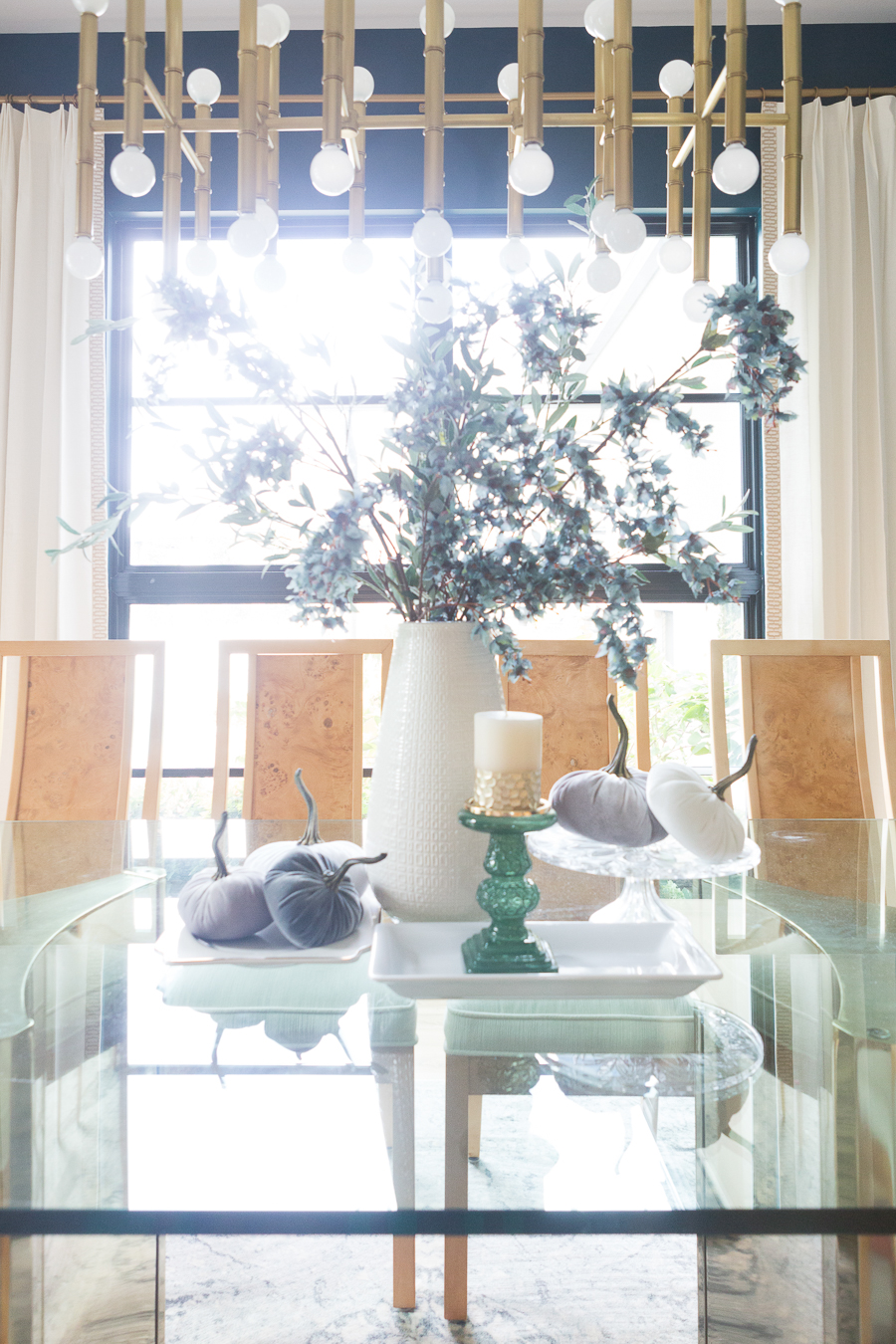 Loveliest Looks of Fall Home Tour Beautiful Fall Home Decor and Fall Fashion Ideas dining room fall tablescape with velvet pumpkins and a white large vase with faux green stems #falldecor #falldecortips #decoratingforfall #fallfauxstems #pumpkins #stylingwithpumpkins #falllivingroomdecor #fallkitchendecor #fallkitchenstyling #stylingforfall #fallhomedecor #falltablescape #falldiningroomdecor