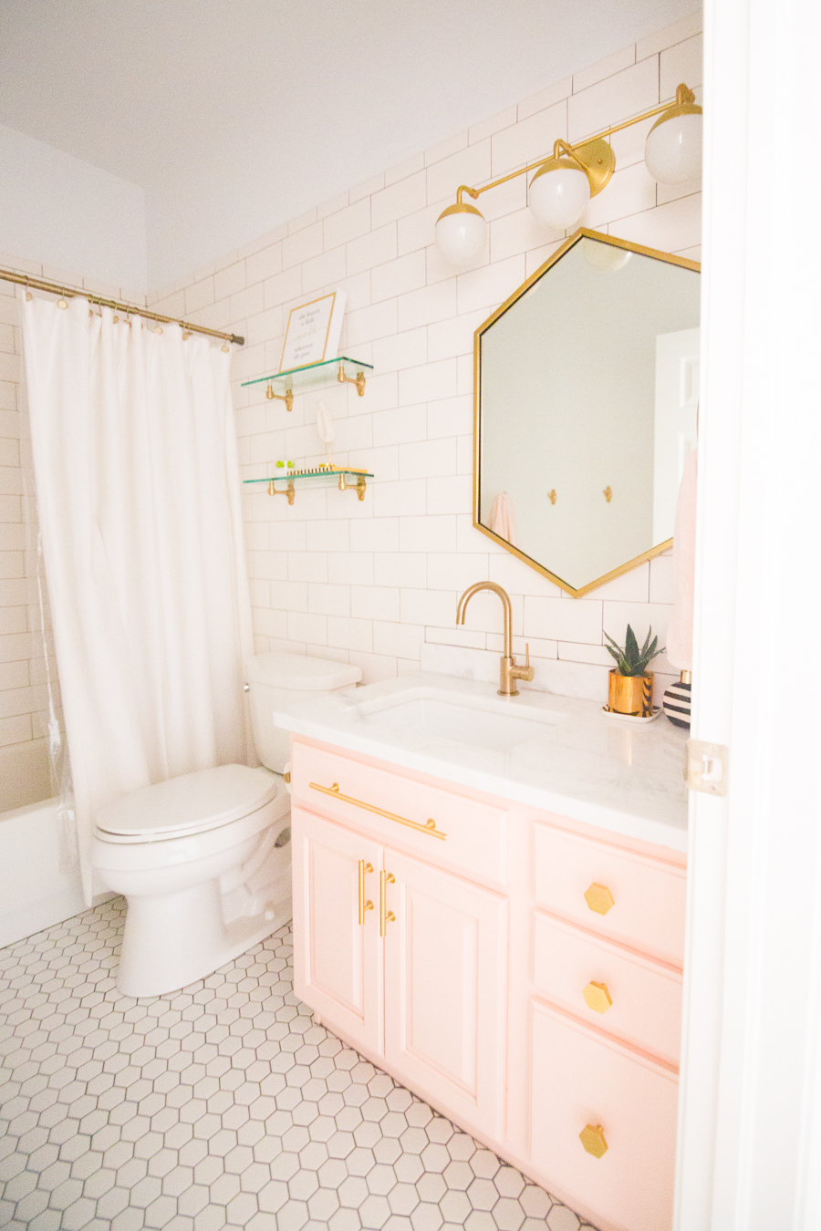 Modern Glam Blush Girls Bathroom Design gold hexagon mirror blush cabinets gold hardware white hexagon floor glass shelves pink bathroom cabinets gold orb sconce-1-3