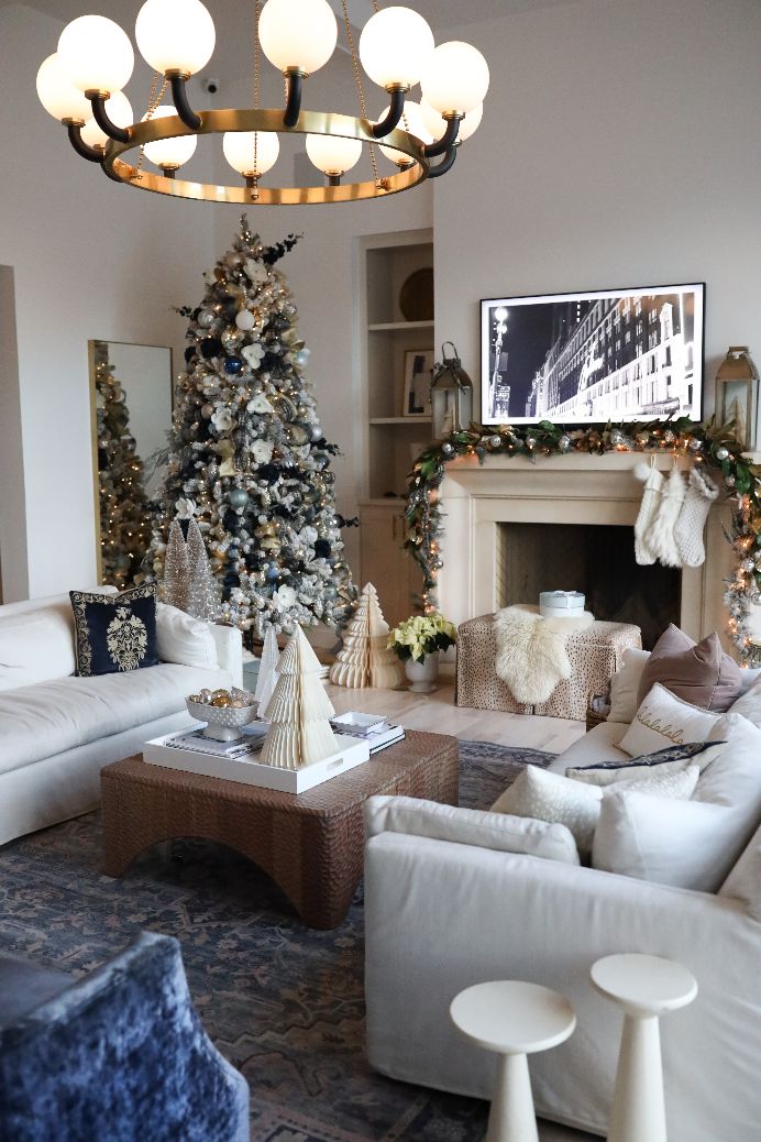 Living room Christmas decor with a christmas tree.