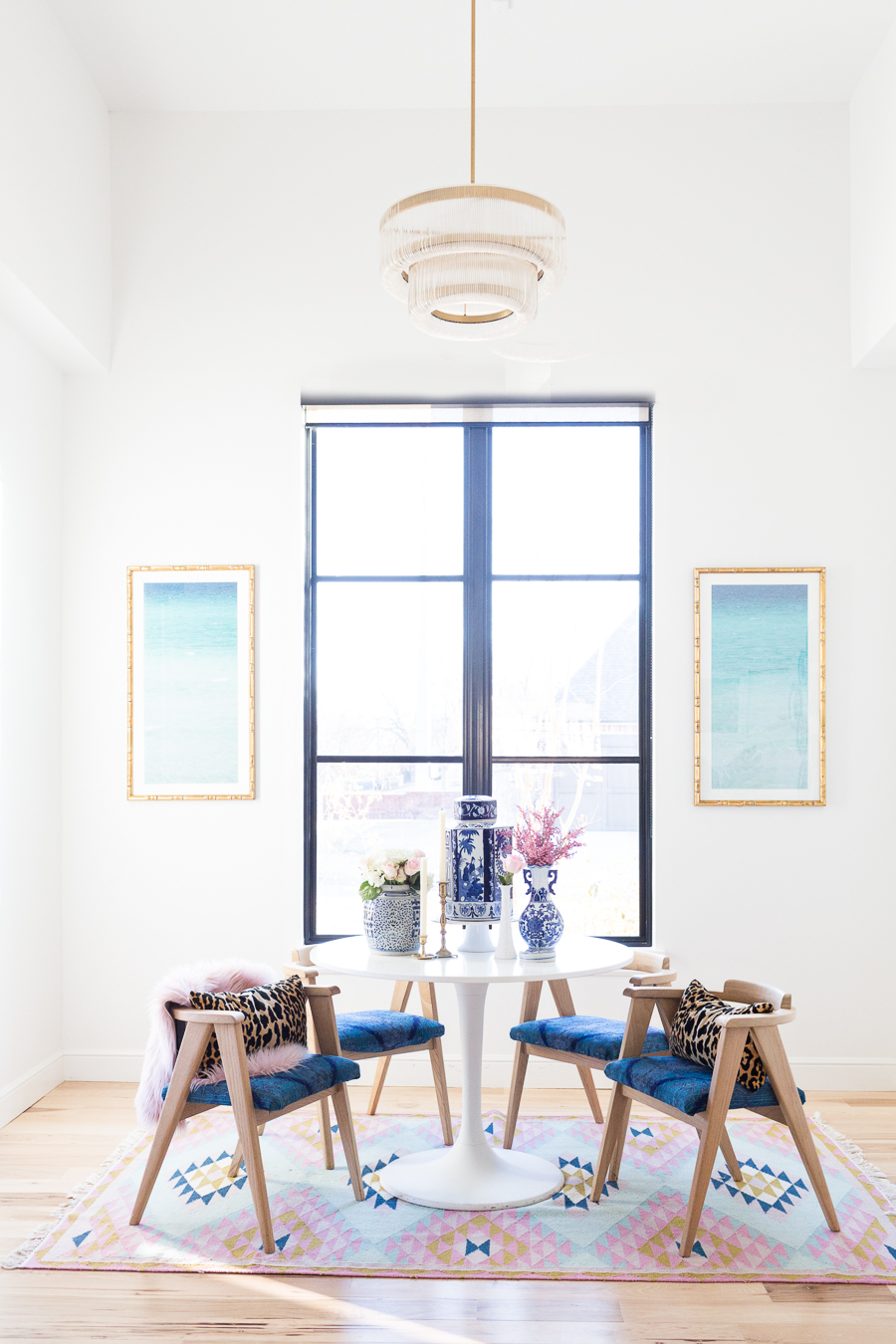 Rooms We Love Home Tour Navy and Pink Modern Glam Breakfast Nook Glittler Guide elodie rug blue and white tabletop vases gold candlesticks black windows wishbone chairs white round table colorful dining room rugs-3.jpg-1.jpg