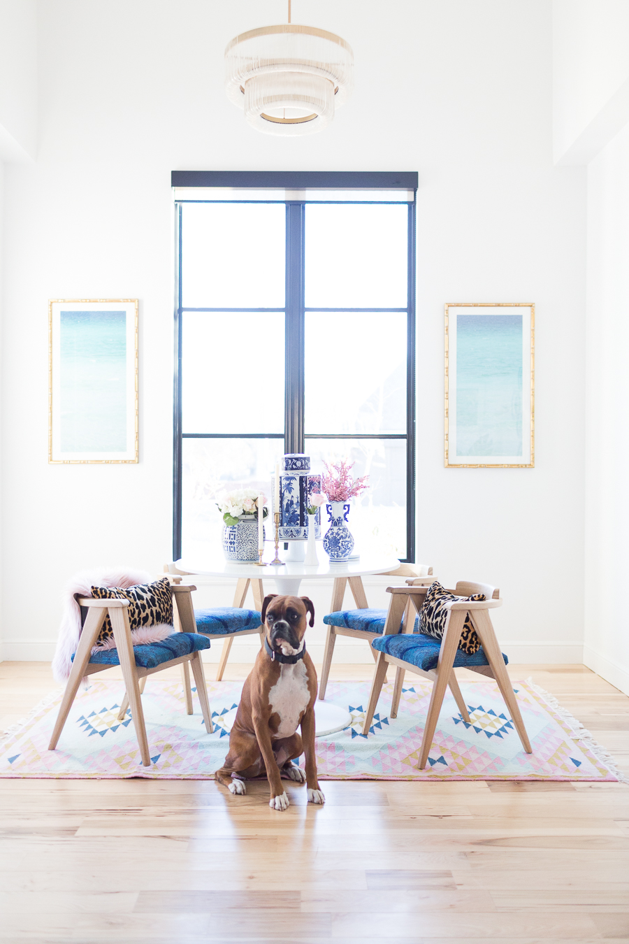 Rooms We Love Home Tour Navy and Pink Modern Glam Breakfast Nook Glittler Guide elodie rug blue and white tabletop vases gold candlesticks black windows wishbone chairs white round table colorful dining room rugs-3.jpg-1.jpg