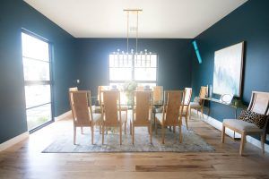 dark walls dining room, best paint colors for dark walls, benjamin moore dark harbor, dark bahrbor paint, green walls, best green paint color, modern glam dining room, dramatic dining room, burl wood, burl wood chairs