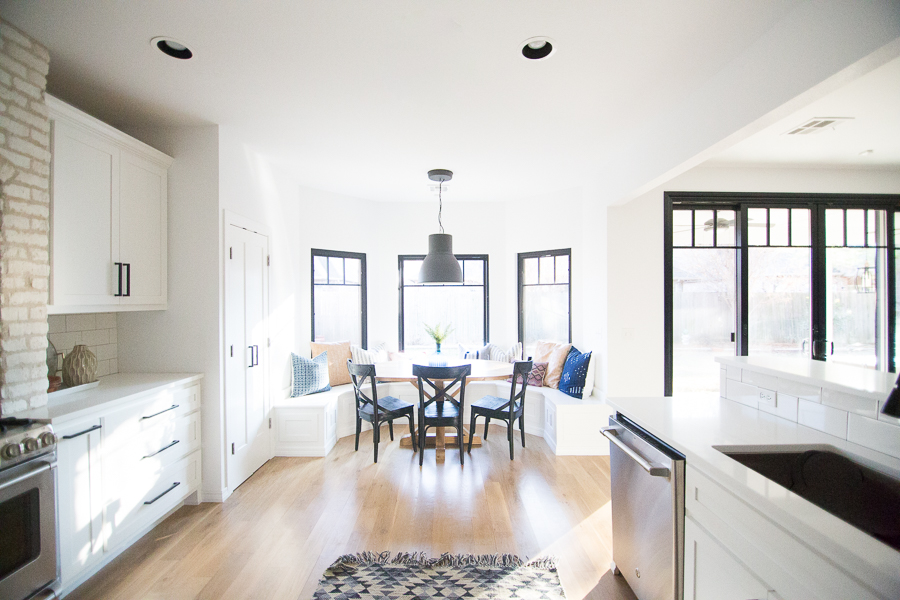 Tulsa Remodel Reveal Modern White Farmhouse with Black WIndows and Doors built in banquette window seat black pendant dining room brick hood kitchen black hardware white kitchen-1