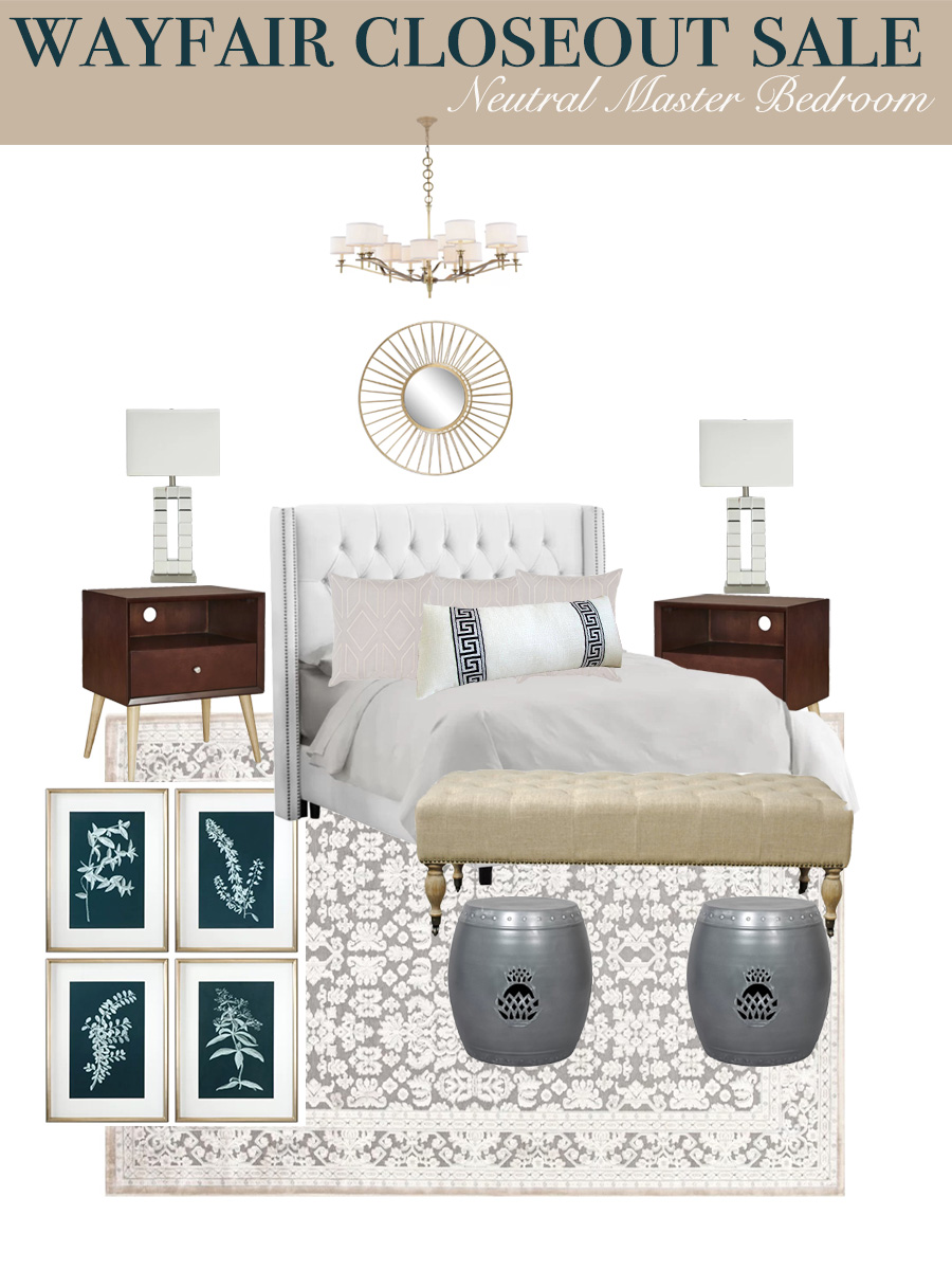 Wayfair Closeout Sale Affordable Upholstered Beds, affordable gray upholstered beds, white upholstered beds, mirrored bedside lamps, master bedroom on a budget, neutral master bedrooms, beautiful neutral bedrooms, affordable wood nigh stands, midcentury modern wood night stands, gold mirror above bed, beautiful gold bedroom light fixtures