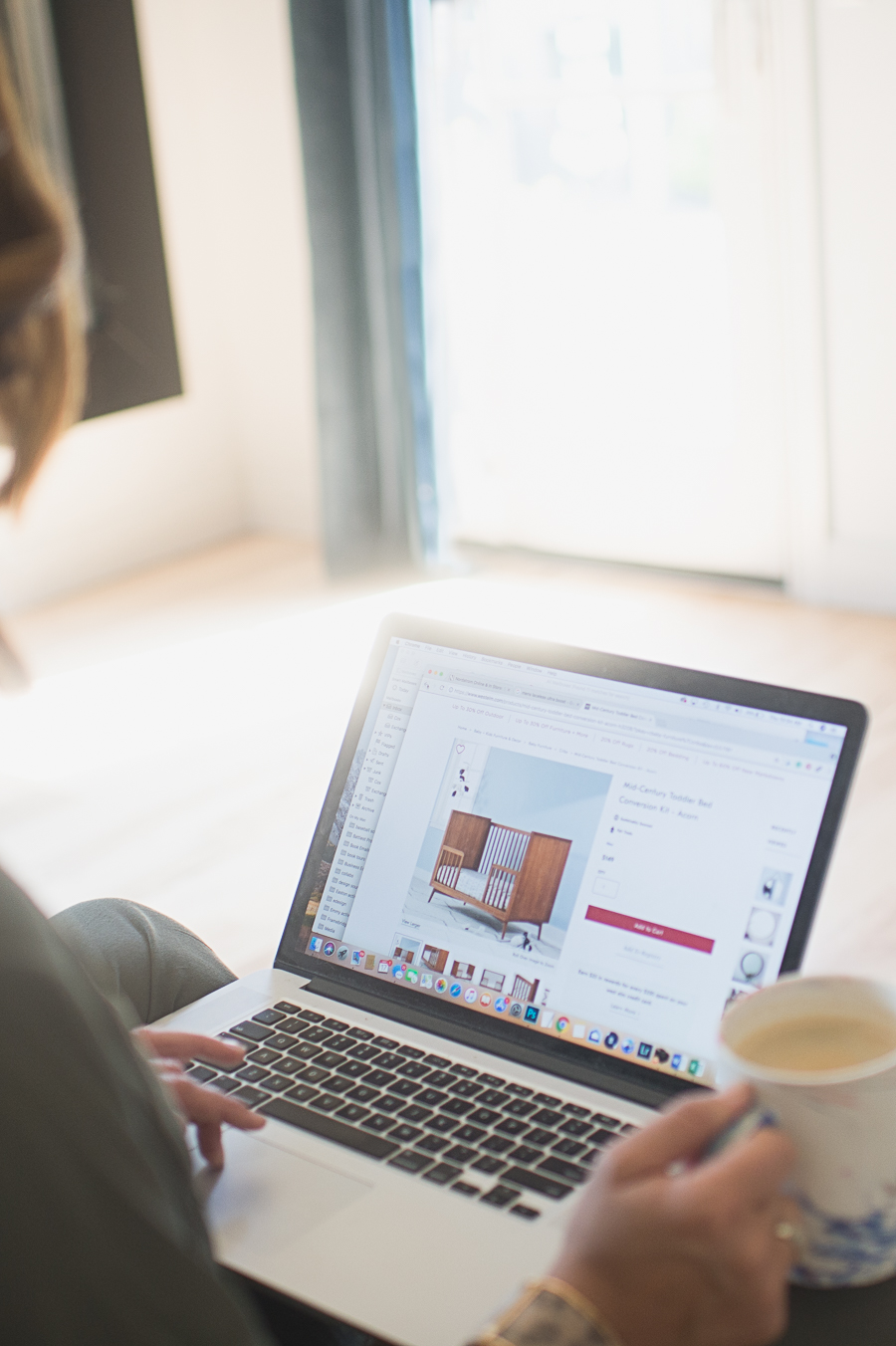 West Elm Modern Baby and Kids Furniture and Home Decor canopy bed master bedroom wood tray hearth and hand vase with peonies linen bedding navy velvet pillows black and white bolster pillow olive Target tie front jumpsuit black night stands juju hat above bed linen bedding baby cribs modern cribs